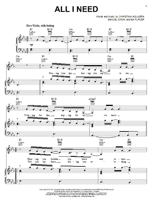 Download or print Christina Aguilera All I Need sheet music, chords and digital score arranged for Piano, Vocal & Guitar Chords (Right-Hand Melody). This Pop score includes 4 page(s).