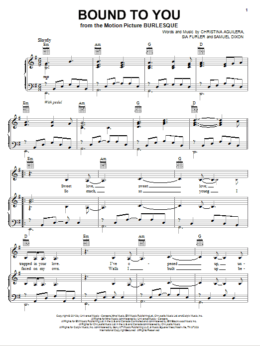 Download or print Christina Aguilera Bound To You (from Burlesque) sheet music, chords and digital score arranged for Piano & Vocal. This Pop score includes 5 page(s).