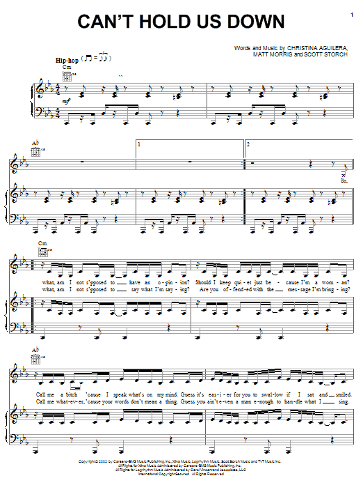 Download or print Christina Aguilera Can't Hold Us Down sheet music, chords and digital score arranged for Piano, Vocal & Guitar Chords. This Pop score includes 8 page(s).