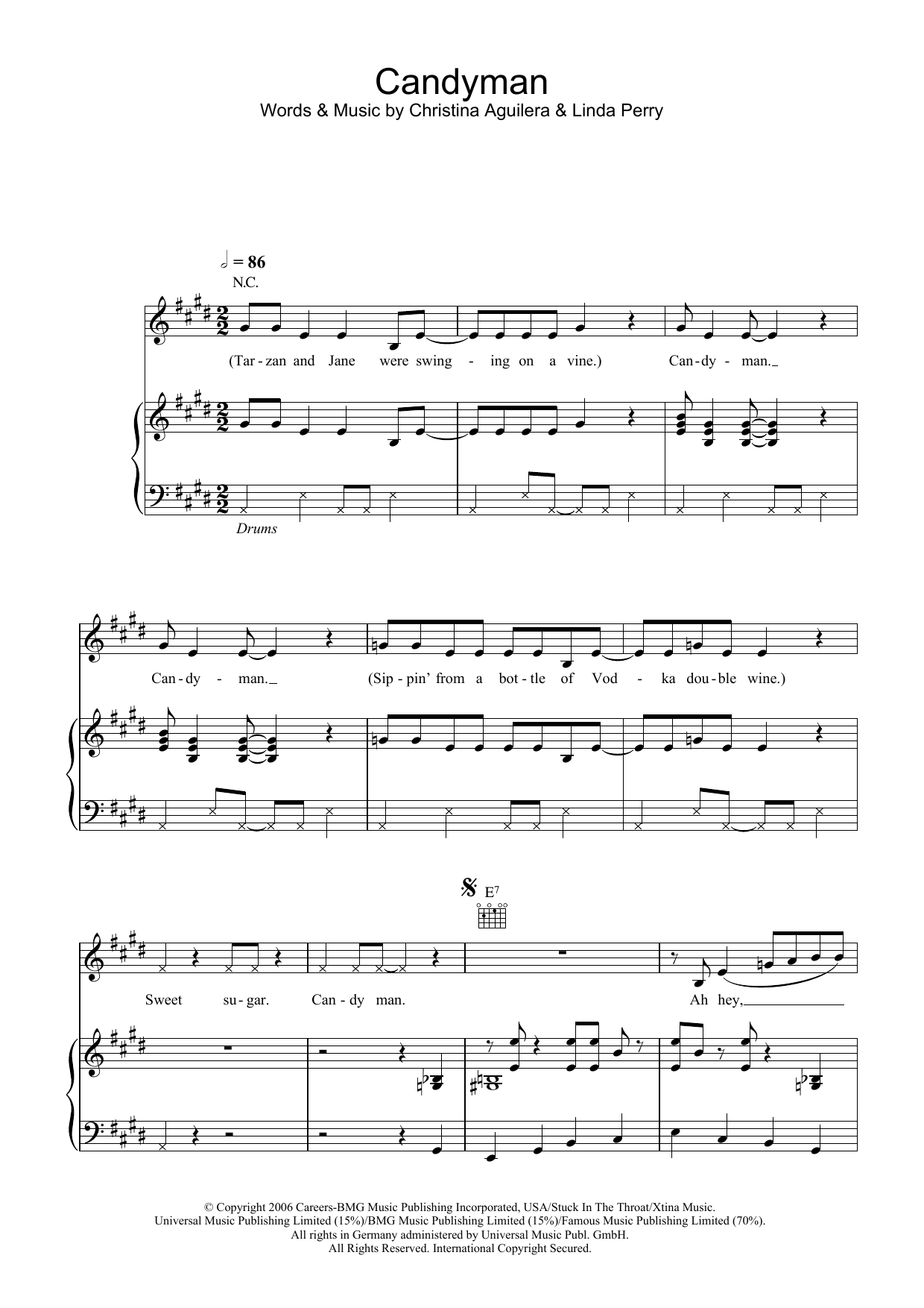 Download or print Christina Aguilera Candyman sheet music, chords and digital score arranged for Piano, Vocal & Guitar Chords (Right-Hand Melody). This Pop score includes 11 page(s).