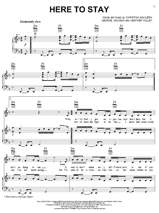 Download or print Christina Aguilera Here To Stay sheet music, chords and digital score arranged for Piano, Vocal & Guitar Chords (Right-Hand Melody). This Pop score includes 6 page(s).