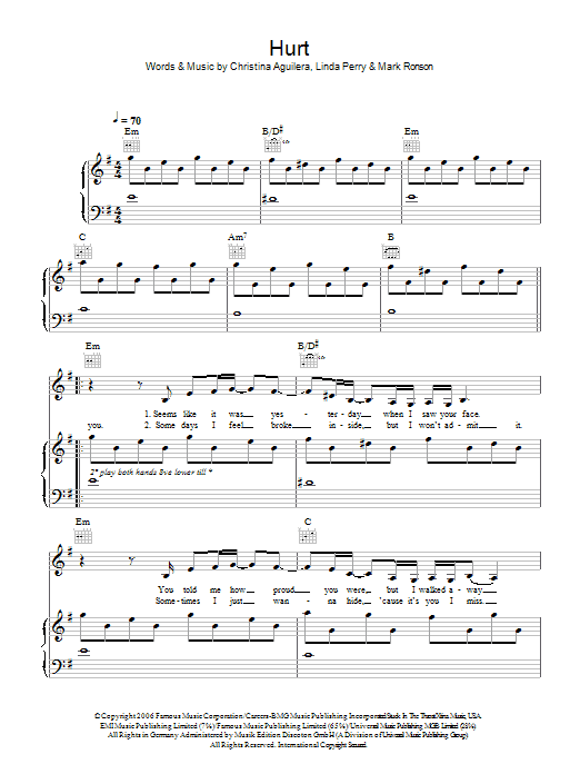 Download or print Christina Aguilera Hurt sheet music, chords and digital score arranged for Piano, Vocal & Guitar Chords (Right-Hand Melody). This Pop score includes 6 page(s).