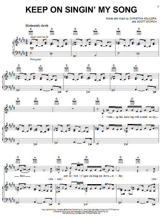 Download or print Christina Aguilera Keep On Singin' My Song sheet music, chords and digital score arranged for Piano, Vocal & Guitar Chords (Right-Hand Melody). This Pop score includes 9 page(s).