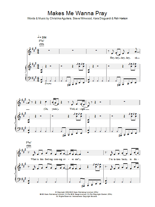 Download or print Christina Aguilera Makes Me Wanna Pray sheet music, chords and digital score arranged for Piano, Vocal & Guitar Chords. This Pop score includes 6 page(s).