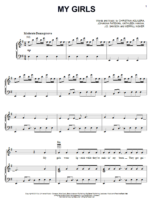 Download or print Christina Aguilera My Girls sheet music, chords and digital score arranged for Piano, Vocal & Guitar Chords (Right-Hand Melody). This Pop score includes 7 page(s).