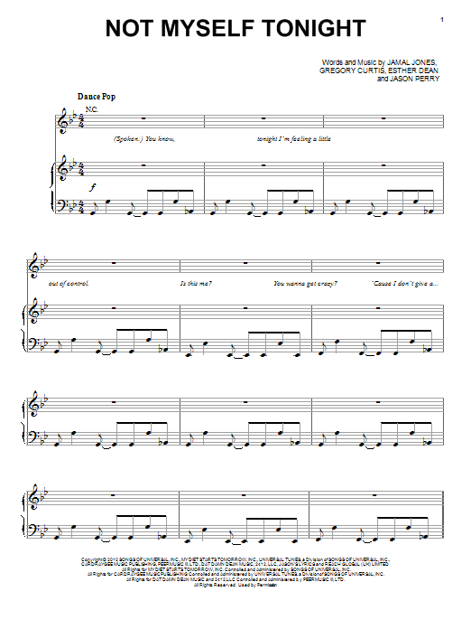Download or print Christina Aguilera Not Myself Tonight sheet music, chords and digital score arranged for Piano, Vocal & Guitar Chords (Right-Hand Melody). This Pop score includes 6 page(s).