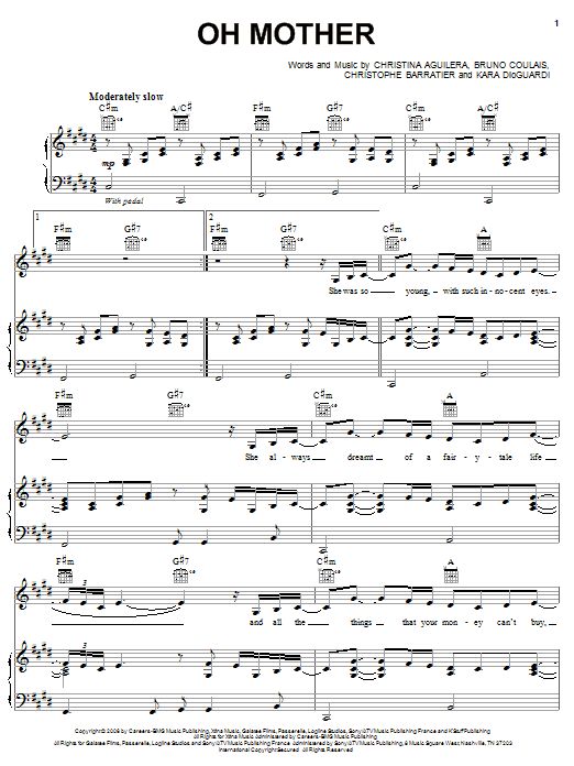 Download or print Christina Aguilera Oh Mother sheet music, chords and digital score arranged for Piano, Vocal & Guitar Chords (Right-Hand Melody). This Pop score includes 8 page(s).