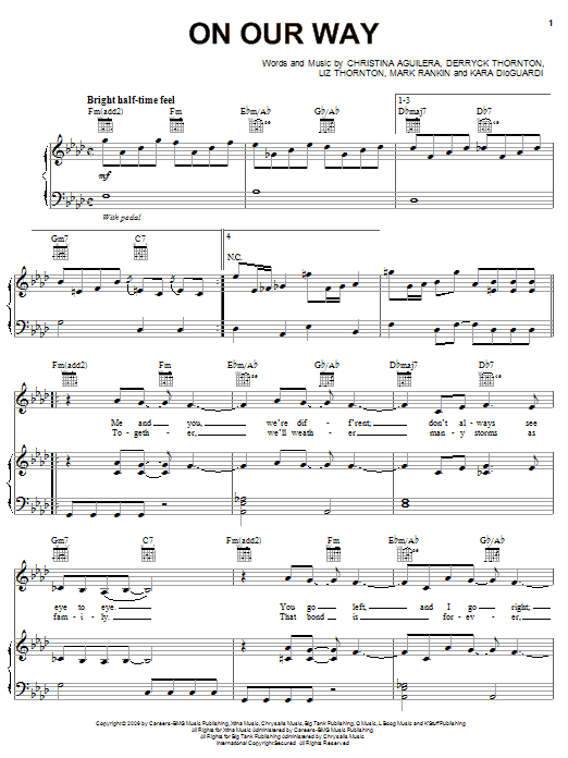 Download or print Christina Aguilera On Our Way sheet music, chords and digital score arranged for Piano, Vocal & Guitar Chords (Right-Hand Melody). This Pop score includes 6 page(s).