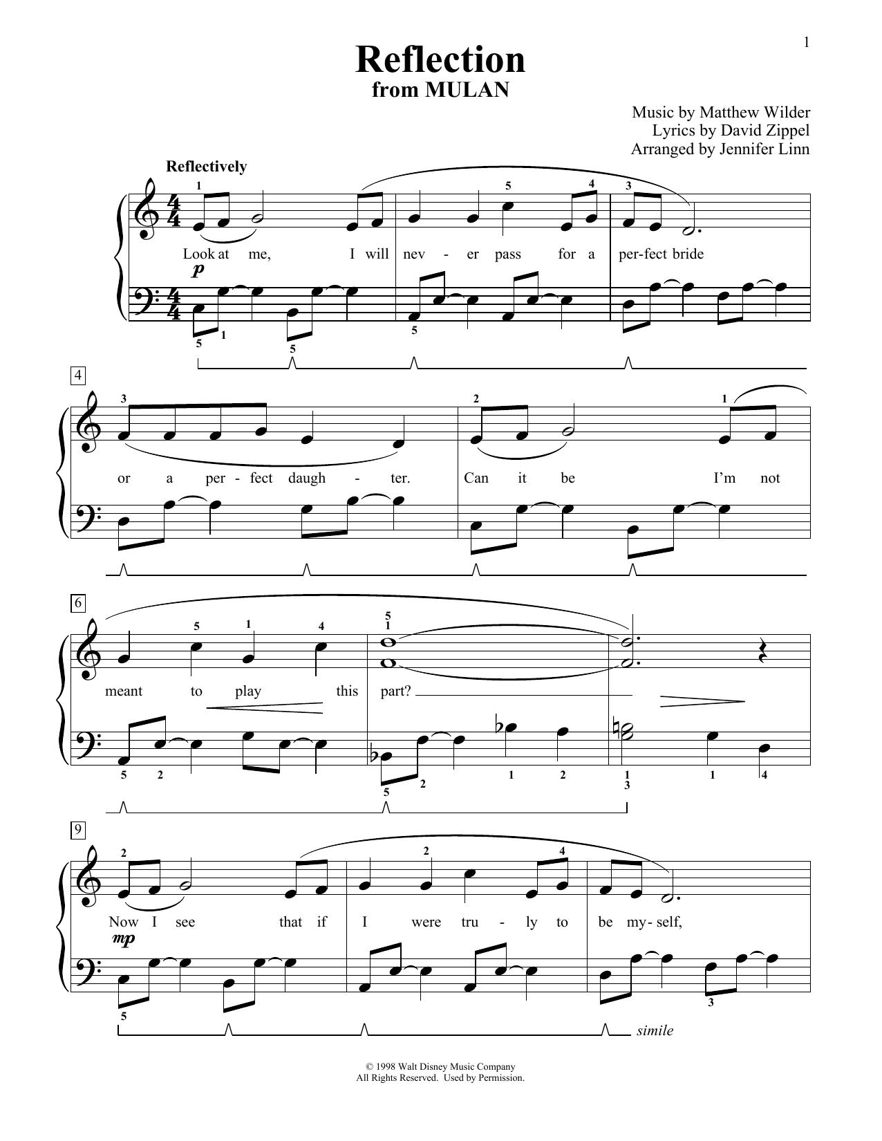 Quick facts Reflection (from Mulan) (arr. Jennifer Linn) about digital sheet music