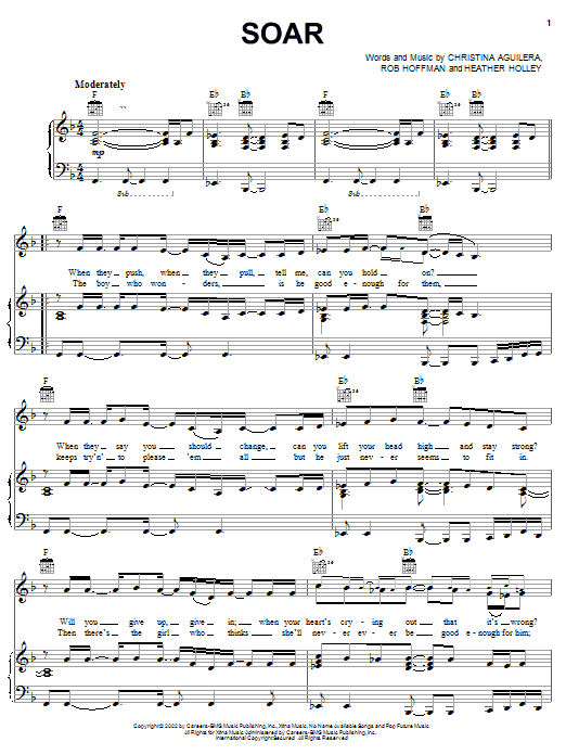 Download or print Christina Aguilera Soar sheet music, chords and digital score arranged for Piano, Vocal & Guitar Chords (Right-Hand Melody). This Pop score includes 7 page(s).