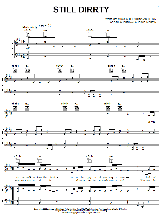 Download or print Christina Aguilera Still Dirrty sheet music, chords and digital score arranged for Piano, Vocal & Guitar Chords (Right-Hand Melody). This Pop score includes 7 page(s).