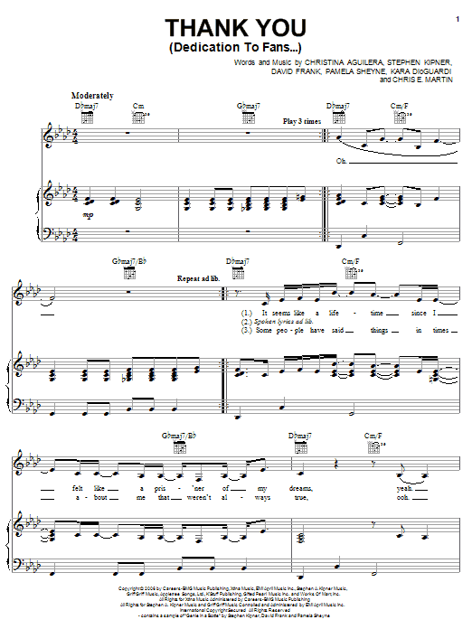 Download or print Christina Aguilera Thank You (Dedication To Fans...) sheet music, chords and digital score arranged for Piano, Vocal & Guitar Chords (Right-Hand Melody). This Pop score includes 6 page(s).