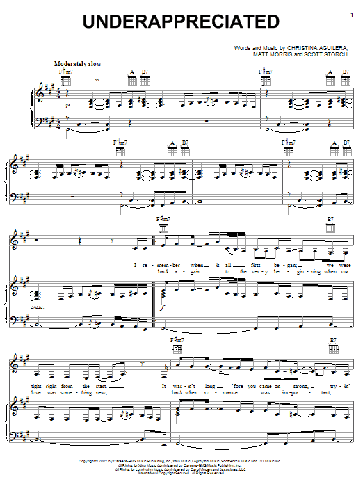 Download or print Christina Aguilera Underappreciated sheet music, chords and digital score arranged for Piano, Vocal & Guitar Chords (Right-Hand Melody). This Pop score includes 6 page(s).