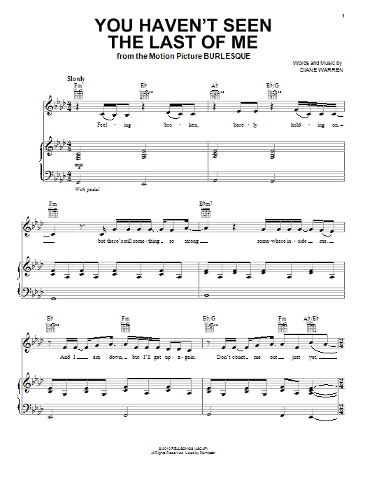 Download or print Christina Aguilera You Haven't Seen The Last Of Me sheet music, chords and digital score arranged for Piano, Vocal & Guitar Chords (Right-Hand Melody). This Pop score includes 7 page(s).