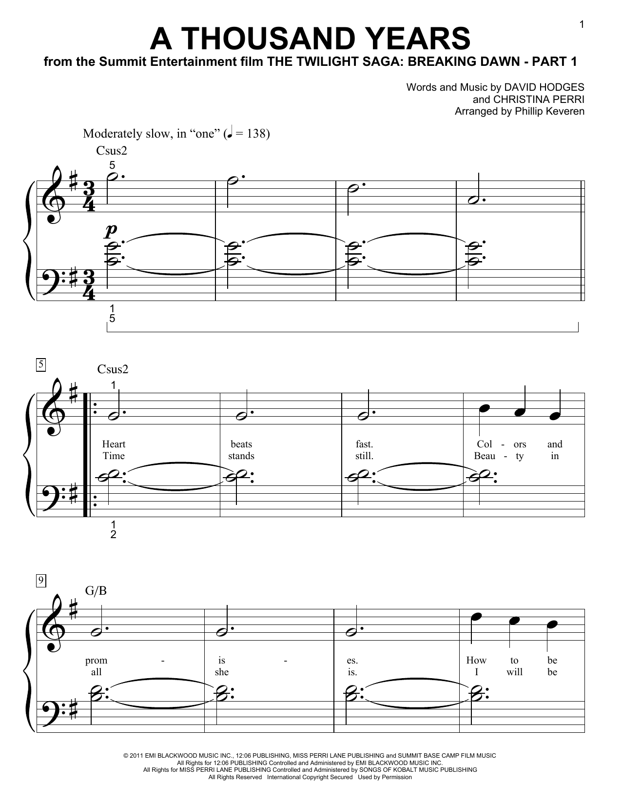 Download or print Christina Perri A Thousand Years (arr. Phillip Keveren) sheet music, chords and digital score arranged for Easy Piano. This Pop score includes 2 page(s).