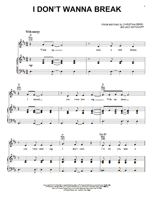 Download or print Christina Perri I Don't Wanna Break sheet music, chords and digital score arranged for Piano, Vocal & Guitar Chords (Right-Hand Melody). This Pop score includes 9 page(s).