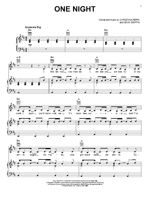 Download or print Christina Perri One Night sheet music, chords and digital score arranged for Piano, Vocal & Guitar Chords (Right-Hand Melody). This Pop score includes 5 page(s).