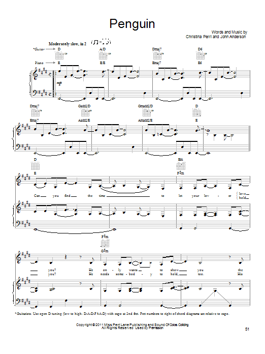 Download or print Christina Perri Penguin sheet music, chords and digital score arranged for Piano, Vocal & Guitar Chords (Right-Hand Melody). This Pop score includes 5 page(s).
