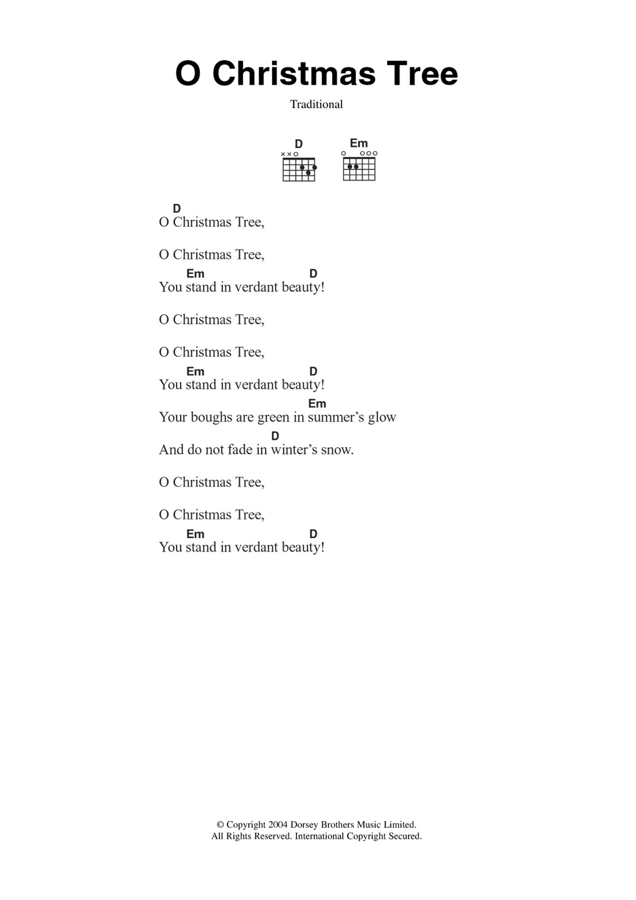 Download or print Christmas Carol O Christmas Tree (O Tannenbaum) sheet music, chords and digital score arranged for Guitar Chords/Lyrics. This Christmas score includes 2 page(s).