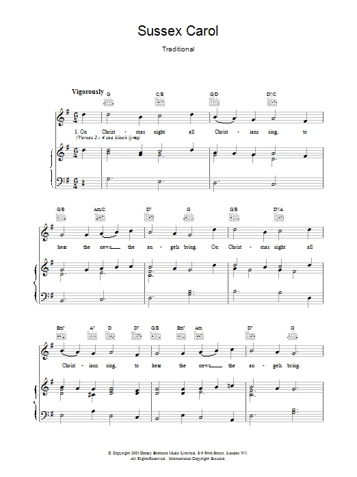 Download or print Christmas Carol Sussex Carol sheet music, chords and digital score arranged for Easy Piano. This Winter score includes 2 page(s).