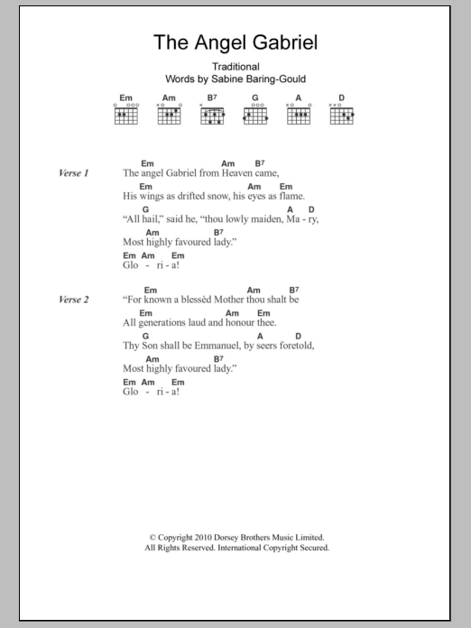 Download or print Christmas Carol The Angel Gabriel sheet music, chords and digital score arranged for Guitar Chords/Lyrics. This Traditional score includes 2 page(s).
