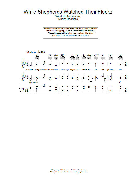 Download or print Christmas Carol While Shepherds Watched Their Flocks sheet music, chords and digital score arranged for Guitar Chords/Lyrics. This Christmas score includes 2 page(s).