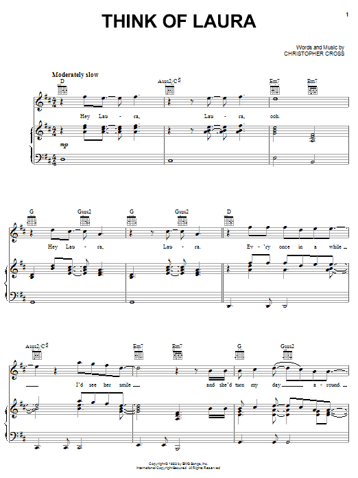 Download or print Christopher Cross Think Of Laura sheet music, chords and digital score arranged for Piano, Vocal & Guitar Chords (Right-Hand Melody). This Love score includes 6 page(s).