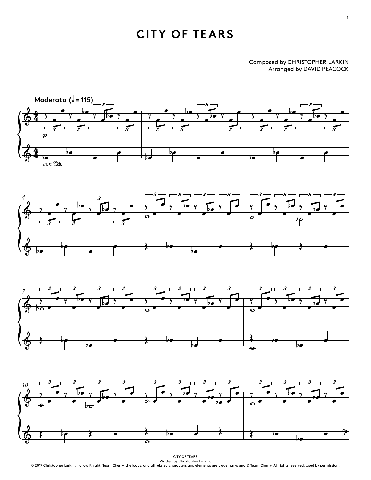Download or print Christopher Larkin City of Tears (from Hollow Knight Piano Collections) (arr. David Peacock) sheet music, chords and digital score arranged for Piano Solo. This Video Game score includes 11 page(s).