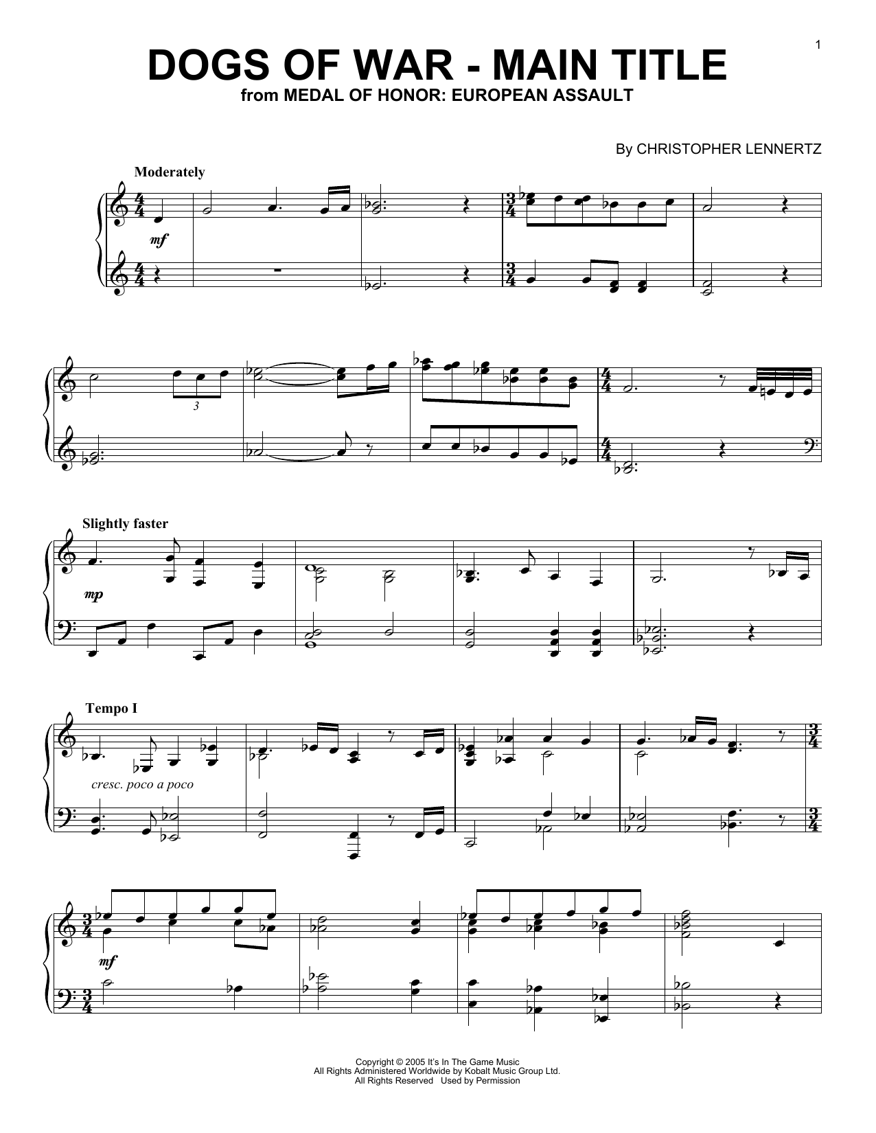 Download or print Christopher Lennertz Dogs Of War - Main Title (from Medal Of Honor: European Assault) sheet music, chords and digital score arranged for Piano Solo. This Video Game score includes 3 page(s).