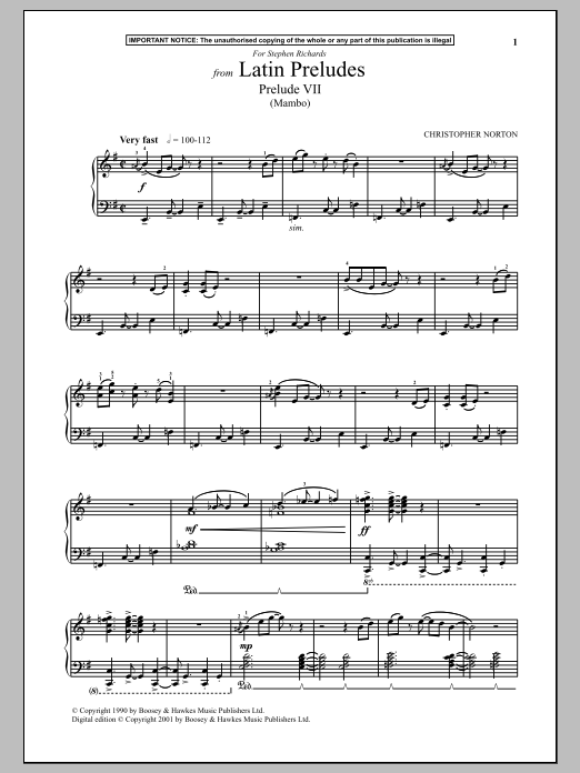 Download or print Christopher Norton Latin Preludes, Prelude VII (Mambo) sheet music, chords and digital score arranged for Piano Solo. This Classical score includes 4 page(s).