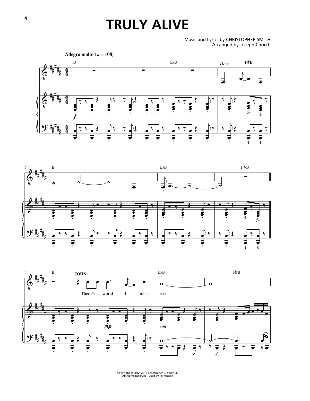 Download or print Christopher Smith Truly Alive sheet music, chords and digital score arranged for Piano & Vocal. This Musical/Show score includes 7 page(s).