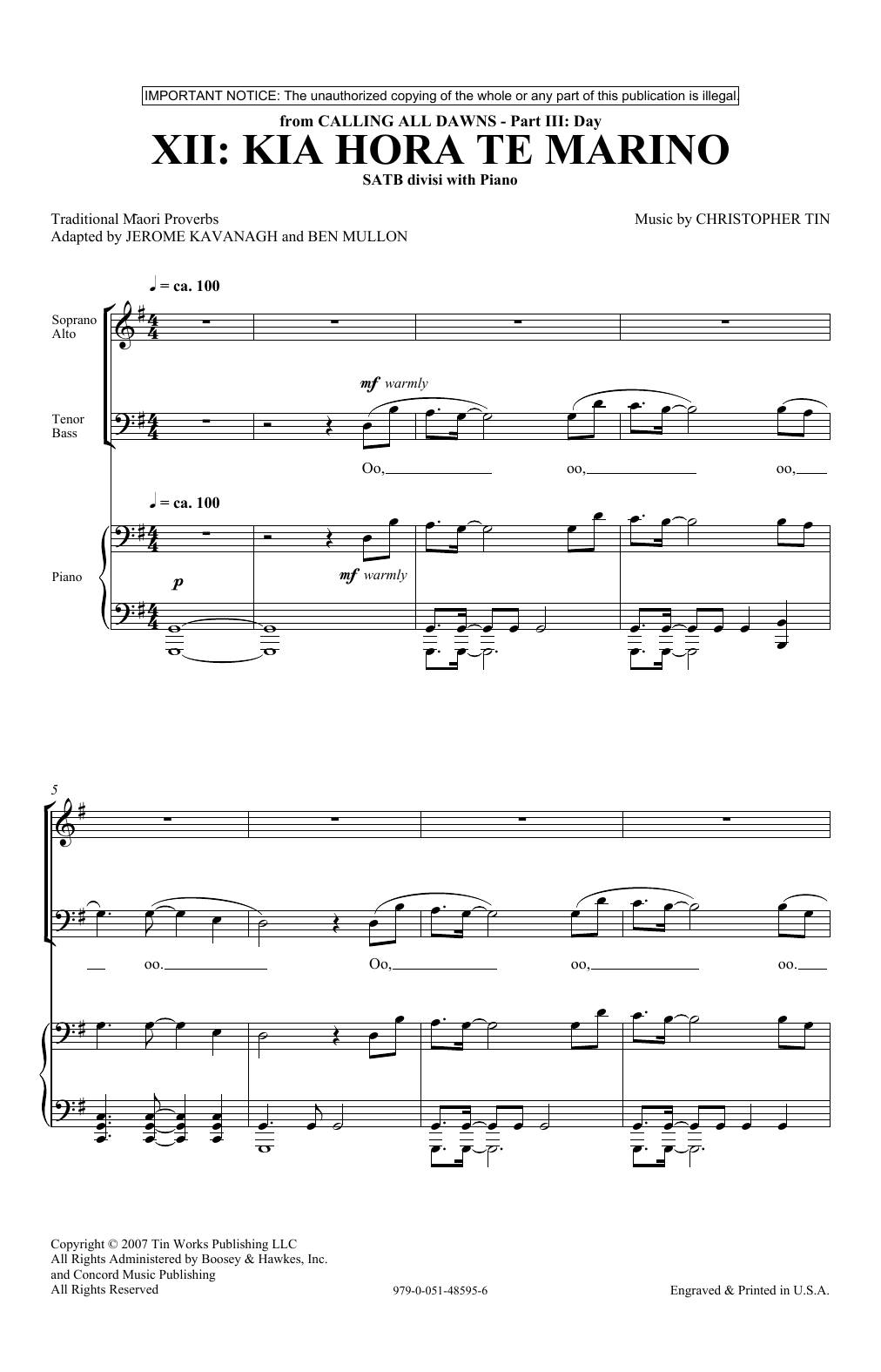 Download or print Christopher Tin Kia Hora Te Marino sheet music, chords and digital score arranged for Choir. This Concert score includes 12 page(s).