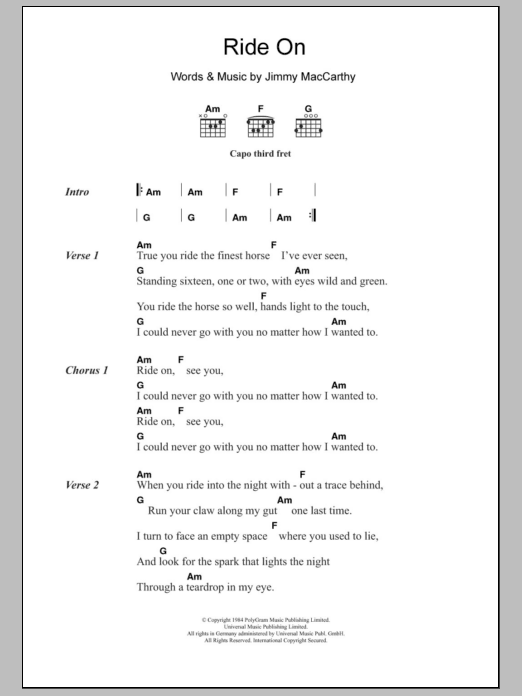 Download or print Christy Moore Ride On sheet music, chords and digital score arranged for Guitar Chords/Lyrics. This Folk score includes 2 page(s).