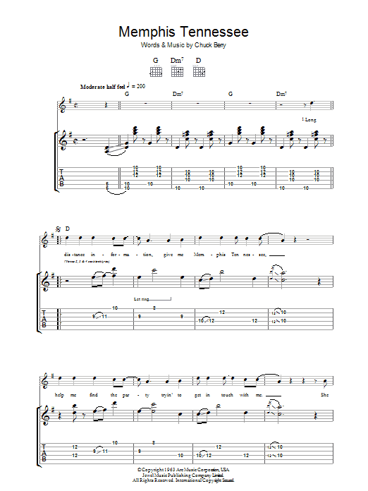 Download or print Chuck Berry Memphis, Tennessee sheet music, chords and digital score arranged for Easy Guitar Tab. This Pop score includes 3 page(s).