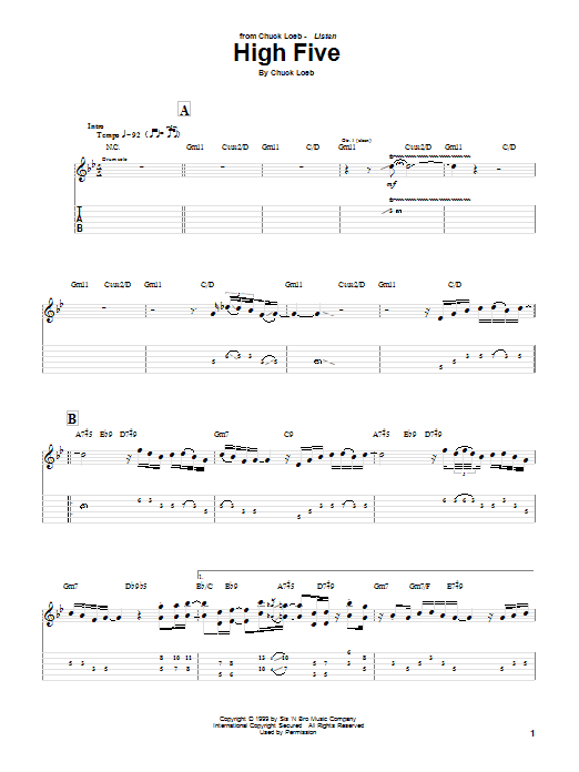 Download or print Chuck Loeb High Five sheet music, chords and digital score arranged for Guitar Tab. This Jazz score includes 7 page(s).
