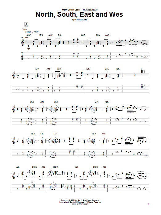 Download or print Chuck Loeb North, South, East And Wes sheet music, chords and digital score arranged for Guitar Tab. This Jazz score includes 6 page(s).