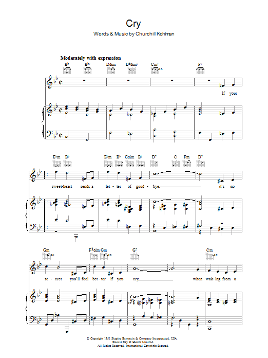 Download or print Churchill Kohlman Cry sheet music, chords and digital score arranged for Piano, Vocal & Guitar Chords. This Pop score includes 3 page(s).