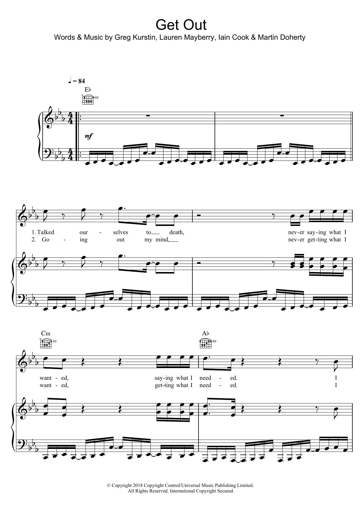 Download or print Chvrches Get Out sheet music, chords and digital score arranged for Piano, Vocal & Guitar Chords. This Pop score includes 7 page(s).