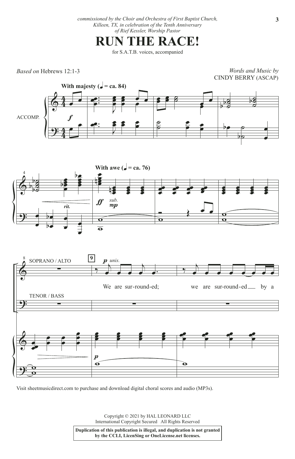 Download or print Cindy Berry Run The Race! sheet music, chords and digital score arranged for SATB Choir. This Sacred score includes 9 page(s).