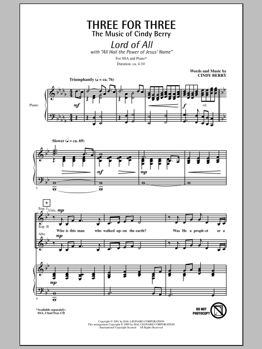 Download or print Cindy Berry Three For Three - Three Songs For Three Parts - Volume 1 sheet music, chords and digital score arranged for SSA Choir. This Concert score includes 23 page(s).