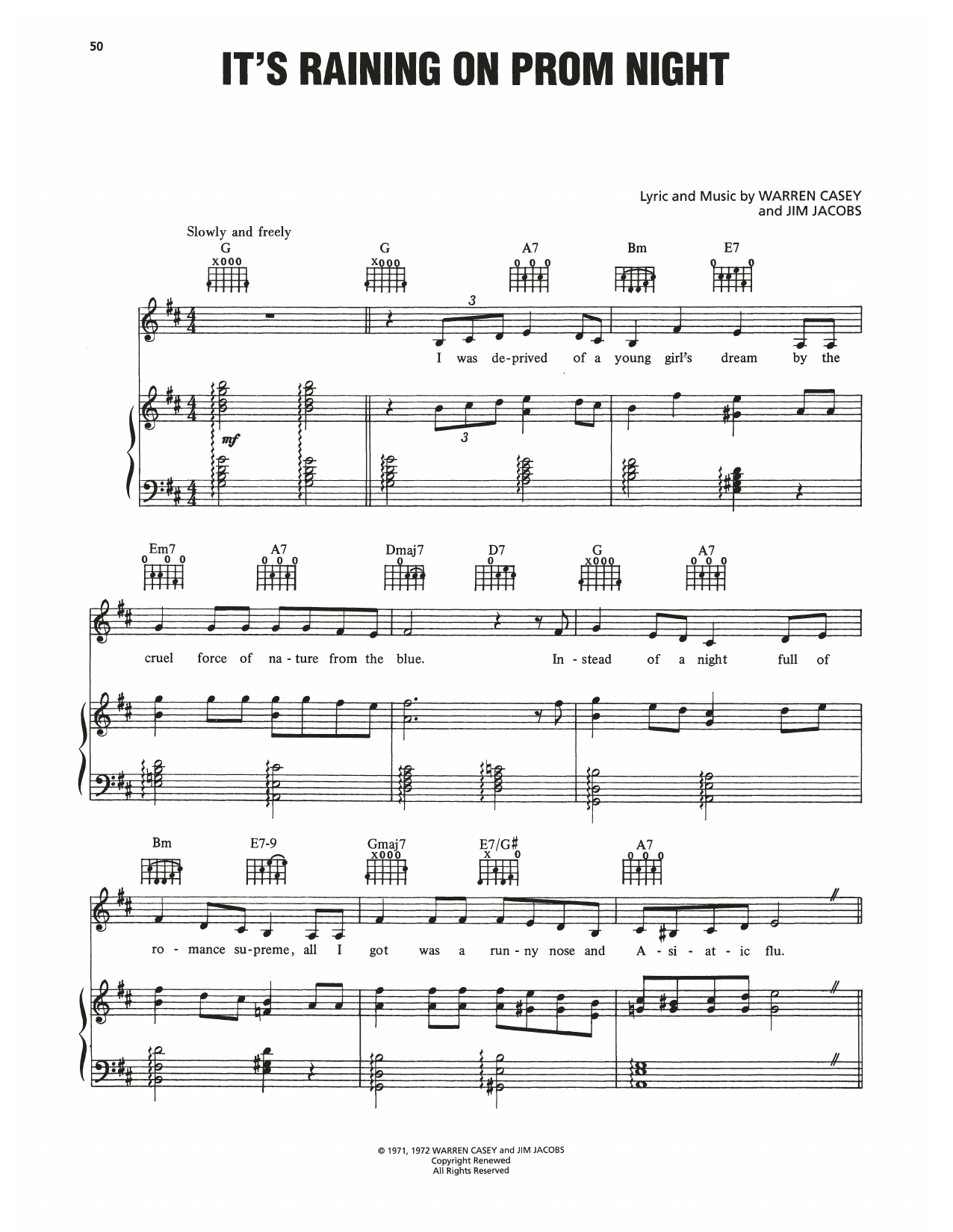 Download or print Cindy Bullens It's Raining On Prom Night (from Grease) sheet music, chords and digital score arranged for Piano, Vocal & Guitar Chords (Right-Hand Melody). This Film/TV score includes 4 page(s).