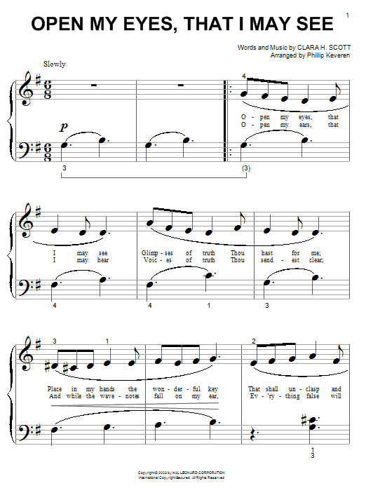 Download or print Clara H. Scott Open My Eyes, That I May See sheet music, chords and digital score arranged for Piano, Vocal & Guitar Chords (Right-Hand Melody). This Sacred score includes 2 page(s).