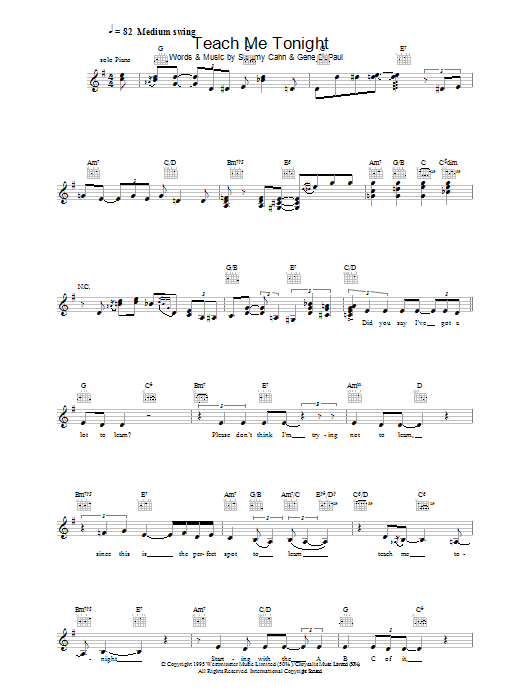 Download or print Sammy Cahn Teach Me Tonight sheet music, chords and digital score arranged for Lead Sheet / Fake Book. This Jazz score includes 4 page(s).