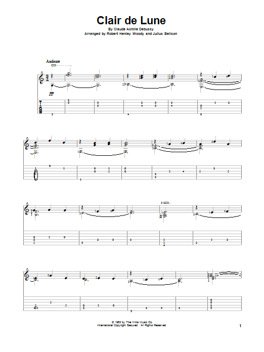 Download or print Robert Henley Woody Clair De Lune sheet music, chords and digital score arranged for Solo Guitar. This Classical score includes 2 page(s).