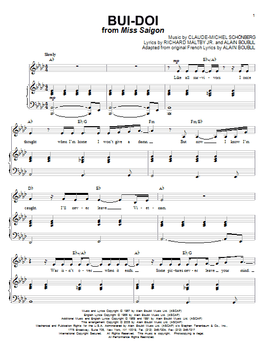 Download or print Claude-Michel Schönberg Bui-Doi sheet music, chords and digital score arranged for Piano & Vocal. This Musical/Show score includes 7 page(s).