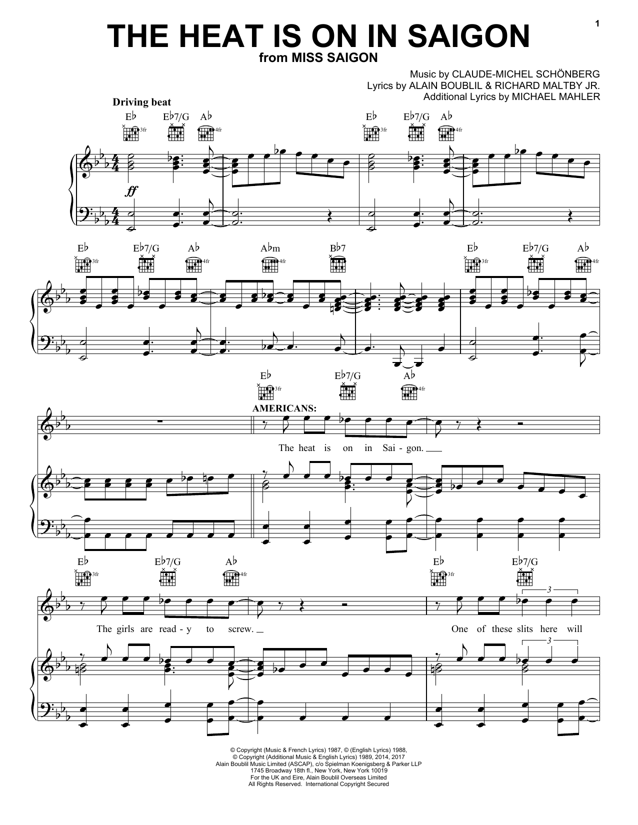 Download or print Claude-Michel Schönberg The Heat Is On In Saigon sheet music, chords and digital score arranged for Piano & Vocal. This Musical/Show score includes 8 page(s).