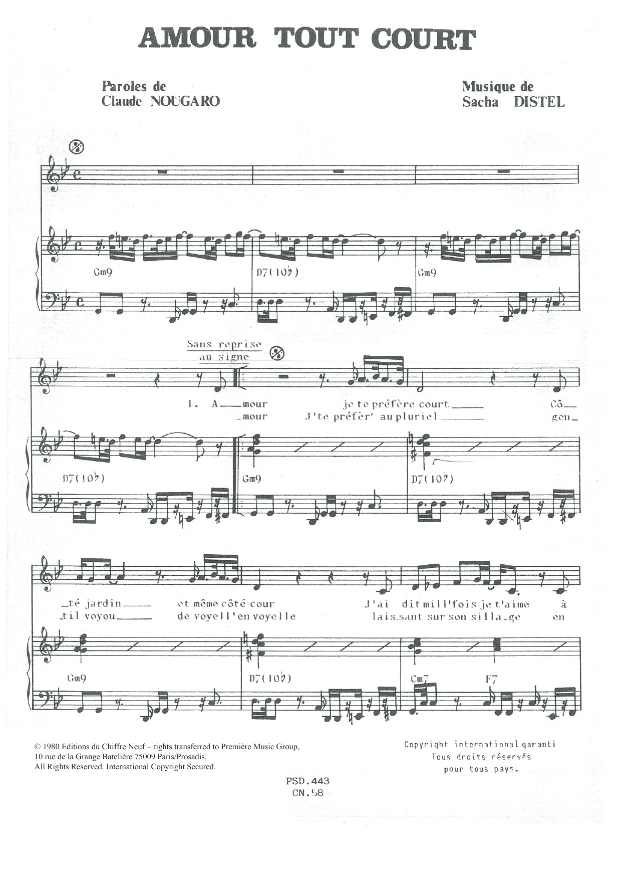 Download or print Claude Nougaro Amour Tout Court sheet music, chords and digital score arranged for Piano & Vocal. This Pop score includes 3 page(s).
