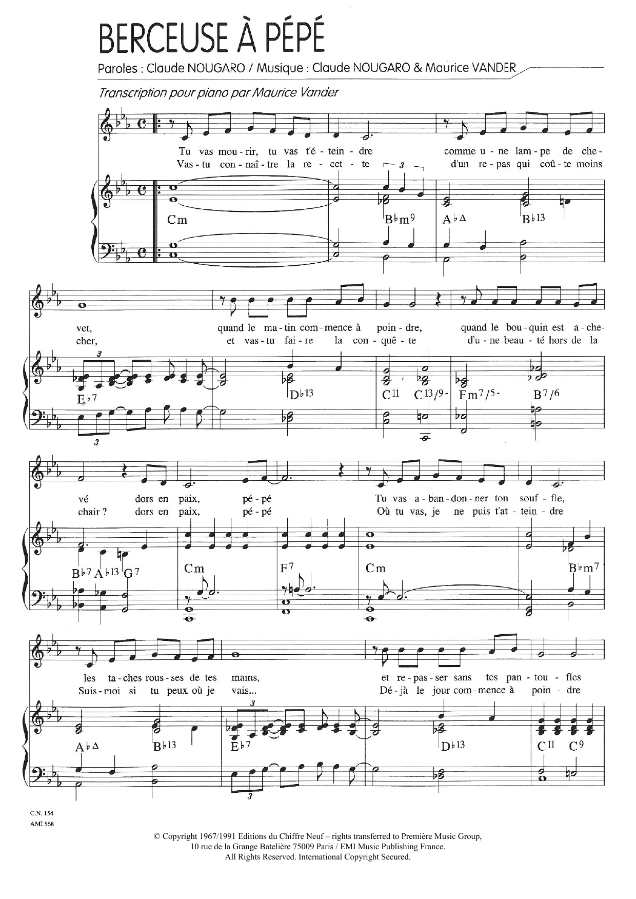 Download or print Claude Nougaro Berceuse A Pepe sheet music, chords and digital score arranged for Piano & Vocal. This Pop score includes 3 page(s).