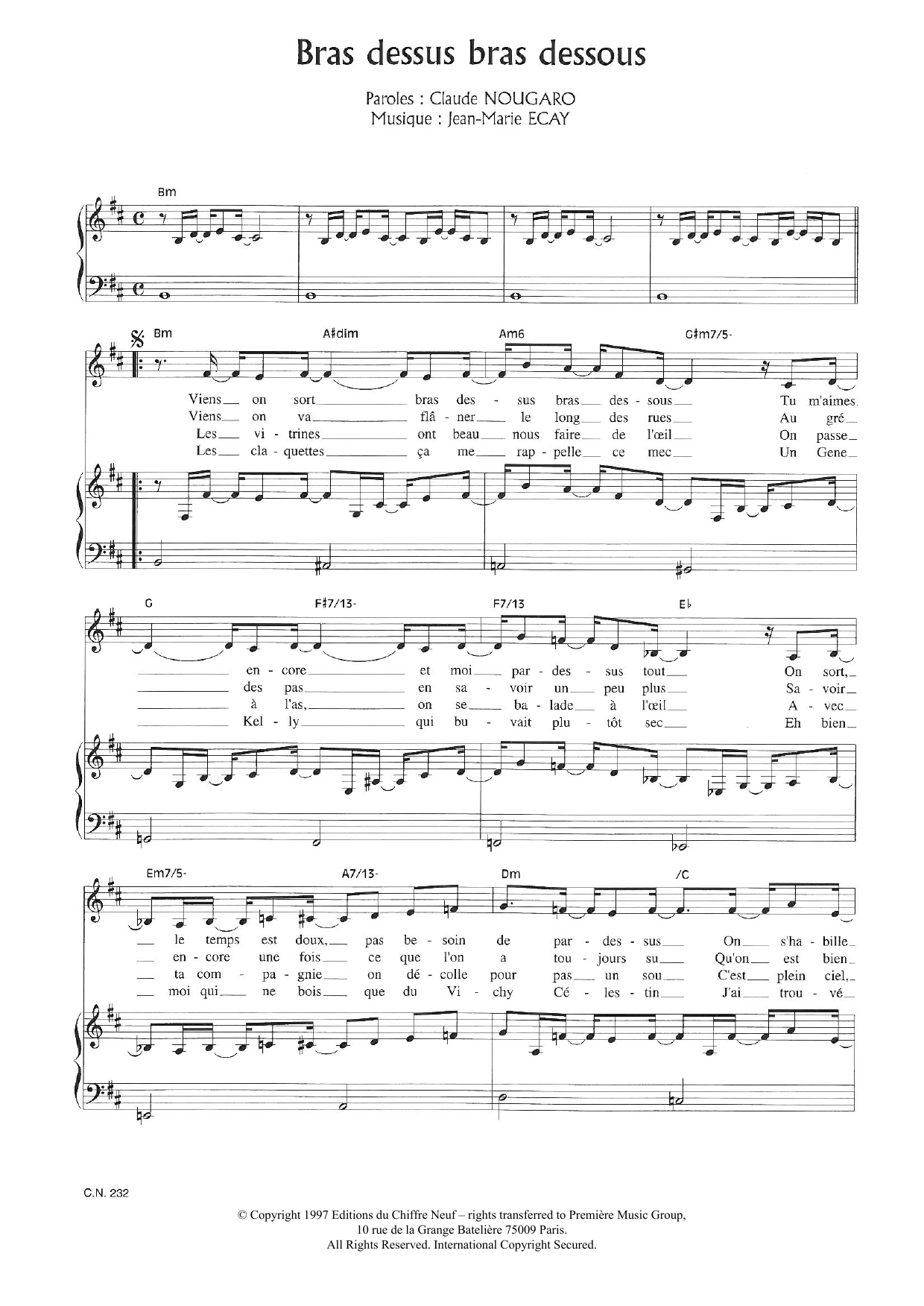 Download or print Claude Nougaro Bras Dessus Bras Dessous sheet music, chords and digital score arranged for Piano & Vocal. This Pop score includes 4 page(s).