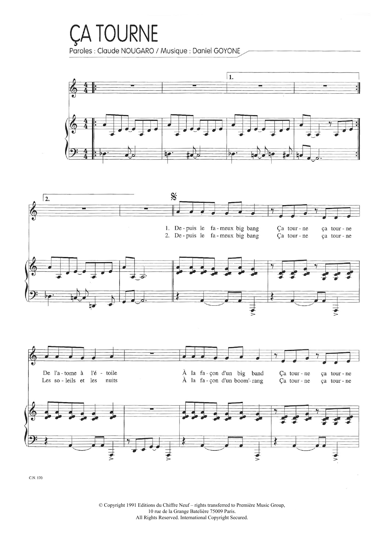 Download or print Claude Nougaro Ca Tourne sheet music, chords and digital score arranged for Piano & Vocal. This Pop score includes 4 page(s).
